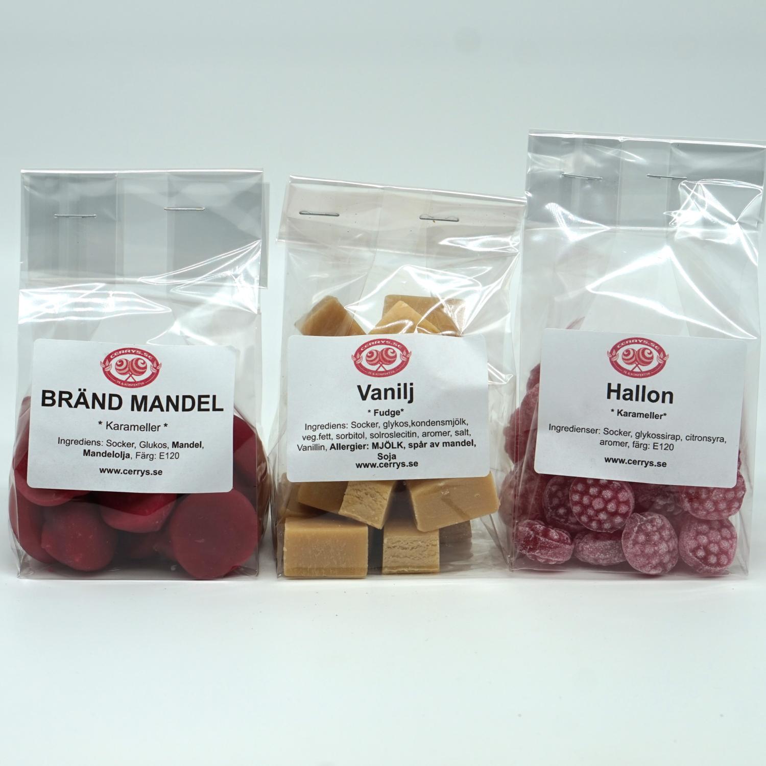 Vaniljfudge: Socker, glykos, veg. fett, KONDENSERAD MJÖLK, sorbitol, vanillin, solroslecitin, aromer & salt (SPÅR AV MANDEL, SOJA)
