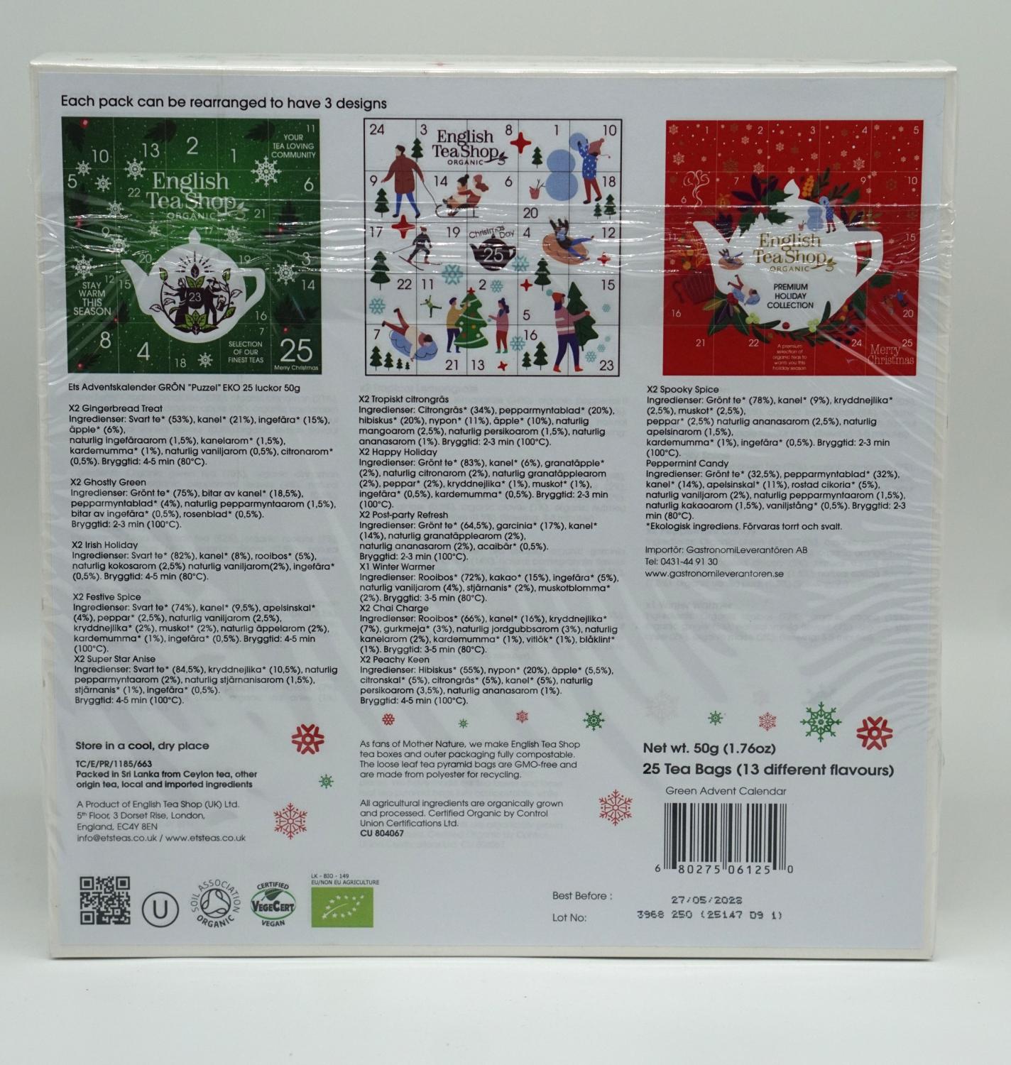 Ingredienser: Gingerbread Treat Ingredienser: Svart te* (53%), kanel* (17%), ingefära* (15%), äpple* (6%), kardemumma* (5%), naturlig arom (4%). Ghostly Green Ingredienser: Grönt te* (73%), bitar av kanel* (14%), bitar av ingefära* (5%), naturlig arom (3%), pepparmyntablad* (4%), rosenblad* (1%). Irish Holiday Ingredienser: Svart te* (82%), rooibos* (5%), kanel* (4,5%), naturlig arom (4,5%), ingefära* (4%). Festive Spice Ingredienser: Svart te* (74%), naturlig arom (4,5%), kanel* (5%), apelsinskal* (4%), ingefära* (2,5%), kardemumma* (2,5%), kryddnejlika* (2,5%), muskot* (2,5%), peppar (2,5%). . Super Star Anise Ingredienser: Svart te* (84%), ingefära* (6%), naturlig arom (4%), kryddnejlika* (4%), stjärnanis* (2%). Tropical Lemongrass Ingredienser: Citrongräs* (24%), pepparmyntablad* (20%), hibiskus* (20%), nypon* (11%), kamomill* (10%), äpple* (10%), naturlig arom (5%). Happy Holiday Ingredienser: Grönt te* (83%), naturlig arom (4%), kanel* (3,5%), granatäpple* (2%), ingefära* (1,5%), kardemumma* (1,5%), kryddnejlika* (1,5%), muskot* (1,5%), peppar* (1,5%). Post-party Refresh Ingredienser: Grönt te* (64%), kanel* (14%), garciniablad* (12%), garciniafrukt* (5%), naturlig arom (4%), acaibär* (1%). Winter Warmer Ingredienser: Rooibos* (60,5%), bitar av ingefära* (15%), kakao* (11,5%), stjärnanis* (5%), muskotblomma* (4%) naturlig arom (4%). Chai Charge Ingredienser: Rooibos* (56%), kanel* (15,75%), kryddnejlika* (12%), gurkmeja* (6%), naturlig arom (4,25%), kardemumma* (4%), vitlök* (1%), blåklint* (1%). Peachy Keen Ingredienser: Hibiskus* (55%), nypon* (20%), citronskal* (5%), citrongräs* (5%), kanel* (5%), äpple* (5,5%), naturlig arom (4,5%). . Spooky Spice Ingredienser: Grönt te* (78%), kanel* (5,5%), naturlig arom (4%), ingefära* (2,5%), kardemumma* (2,5%), kryddnejlika* (2,5%), muskot* (2,5%), peppar* (2,5%). Peppermint Candy Ingredienser: Pepparmyntablad* (32%), grönt te* (32,5%), apelsinskal* (11%), kanel* (14%), rostad cikoria* (5%), naturlig arom (5%), vaniljstång* (0,5%).
