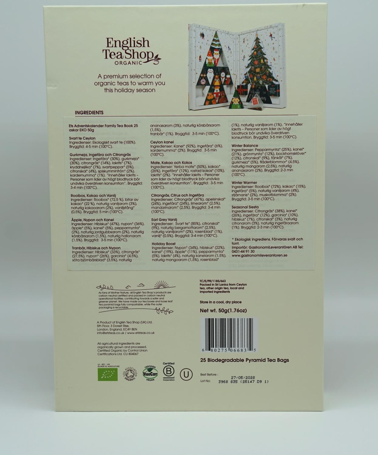 Holiday boost - Ingredienser: Nypon* (34%), hibiskus* (22%), kanel* (19%), äpple* (11%), pepparmynta* (5%), lakrits* (4%), naturlig kanelarom (1,5%), naturlig mangoarom (1,5%), rosenblad* (1%), naturlig vaniljarom (1%). Innehåller lakrits – Personer som lider av högt blodtryck bör undvika överdriven konsumtion. Bryggtid: 3-5 minuter.